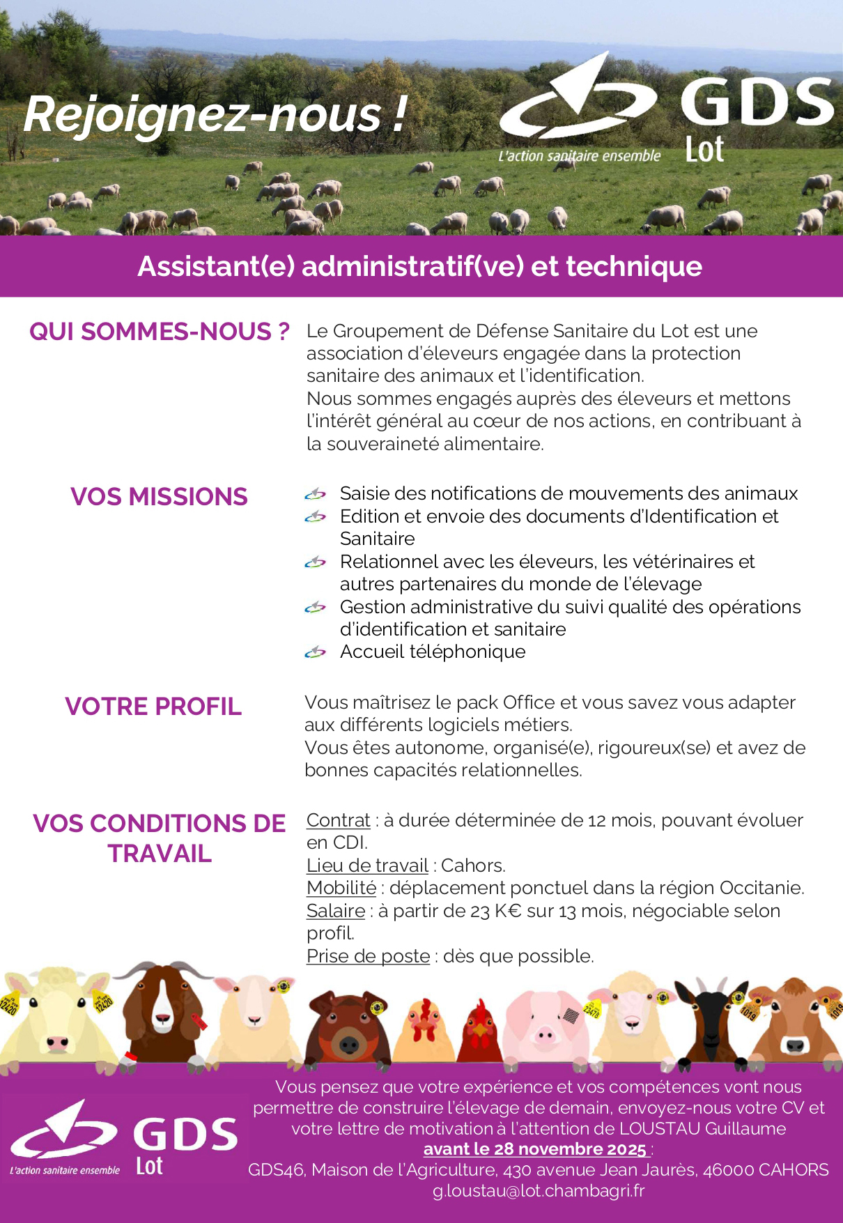 Actualité novembre 5, 2025 Aucun Commentaire 396 Offre d’emploi : assistant(e) adminstratif(ve) et technique (Groupement de défense sanitaire du Lot) ✍️ TEST SIGNATURE