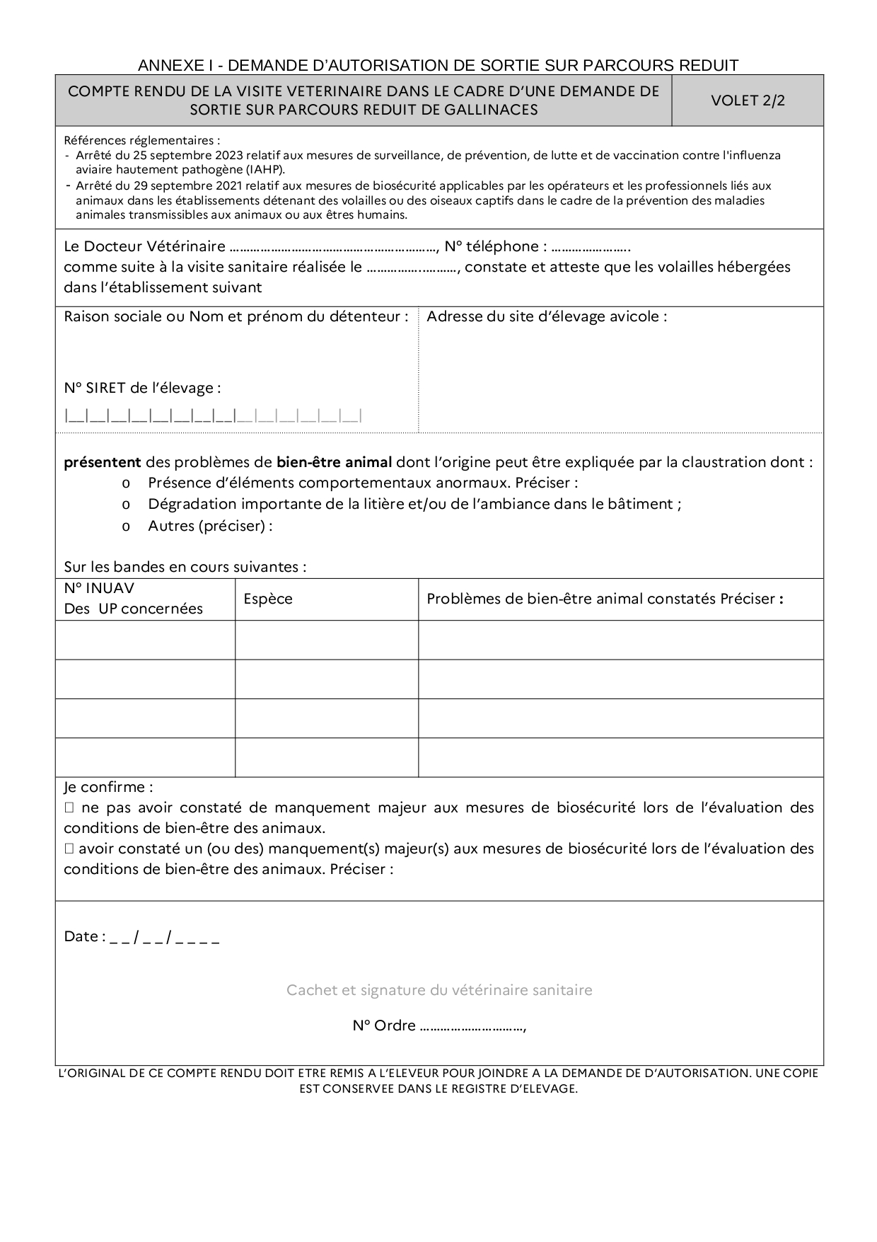 - la déclaration auprès de la DDETSPP (via le formulaire ci-dessous ou la démarche simplifiée : https://www.demarches-simplifiees.fr/commencer/declaration-de-sortie-des-volailles-sur-parcours-46)
