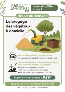 Nouveau au catalogue de CVS Parcs et Jardins, le broyage des végétaux directement à domicile. Branches, tailles de haies, résidus de coupe… l’équipe intervient chez les particuliers avec le matériel adapté et prend tout en charge sur place. Fini les remorques à charger, les déplacements en déchetterie et la perte de temps car le service est pensé pour simplifier la vie des propriétaires de jardins. Le broyat obtenu peut ensuite être réutilisé sur place comme paillage naturel pour les haies, massifs ou potagers. Une solution à la fois économique et écologique, qui limite le développement des mauvaises herbes, réduit les besoins en arrosage, et évite l’achat de paillage ou de compost.